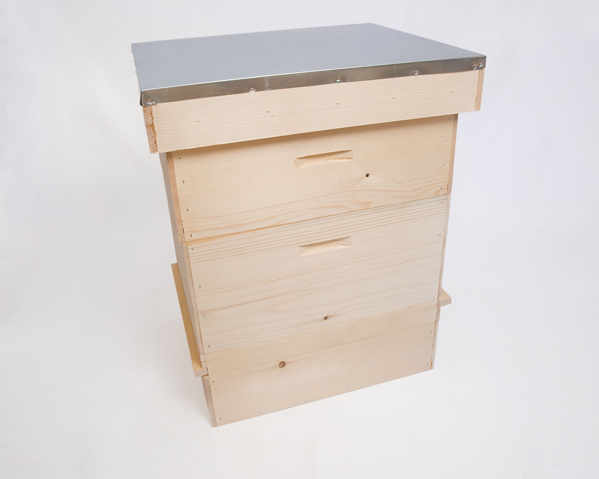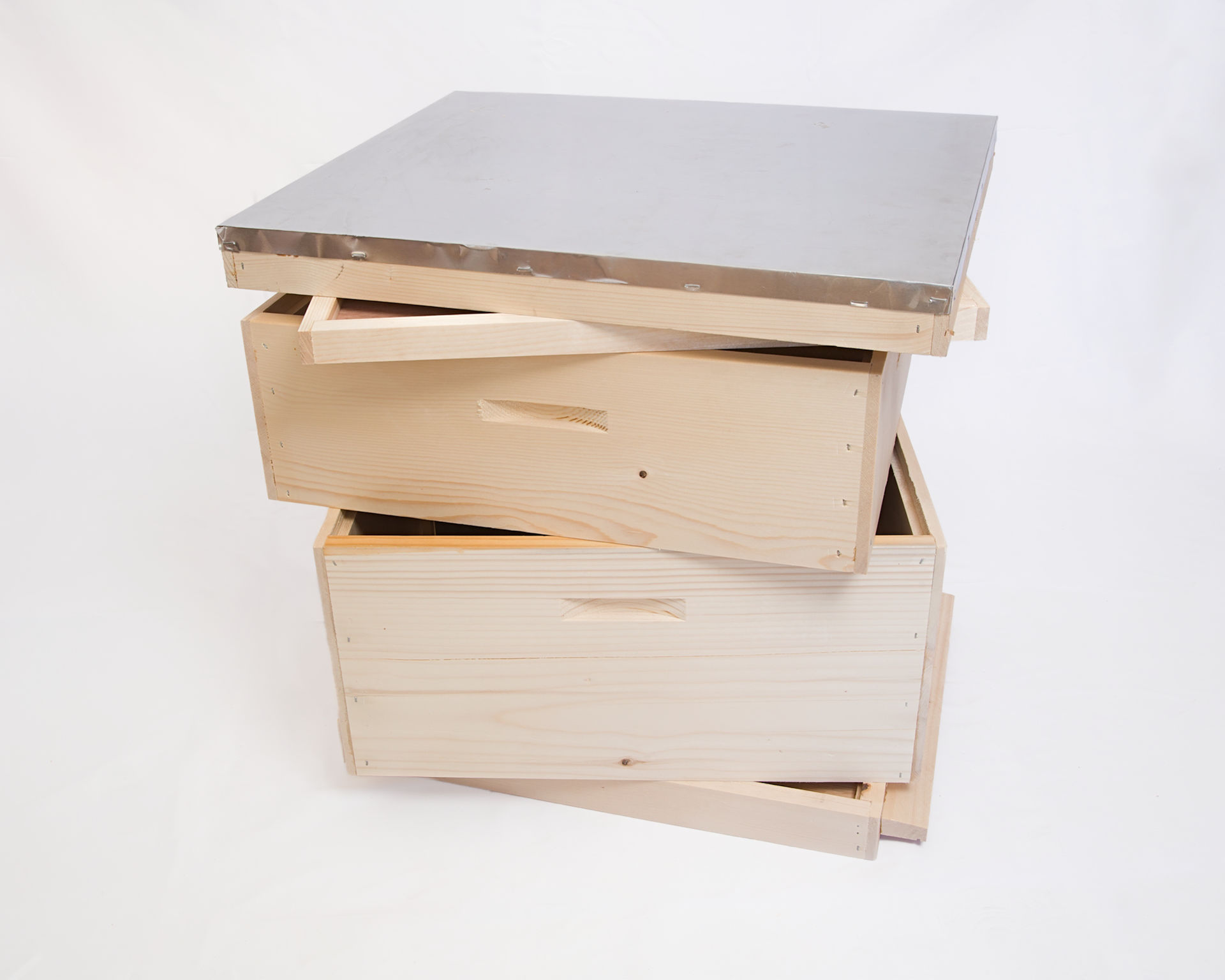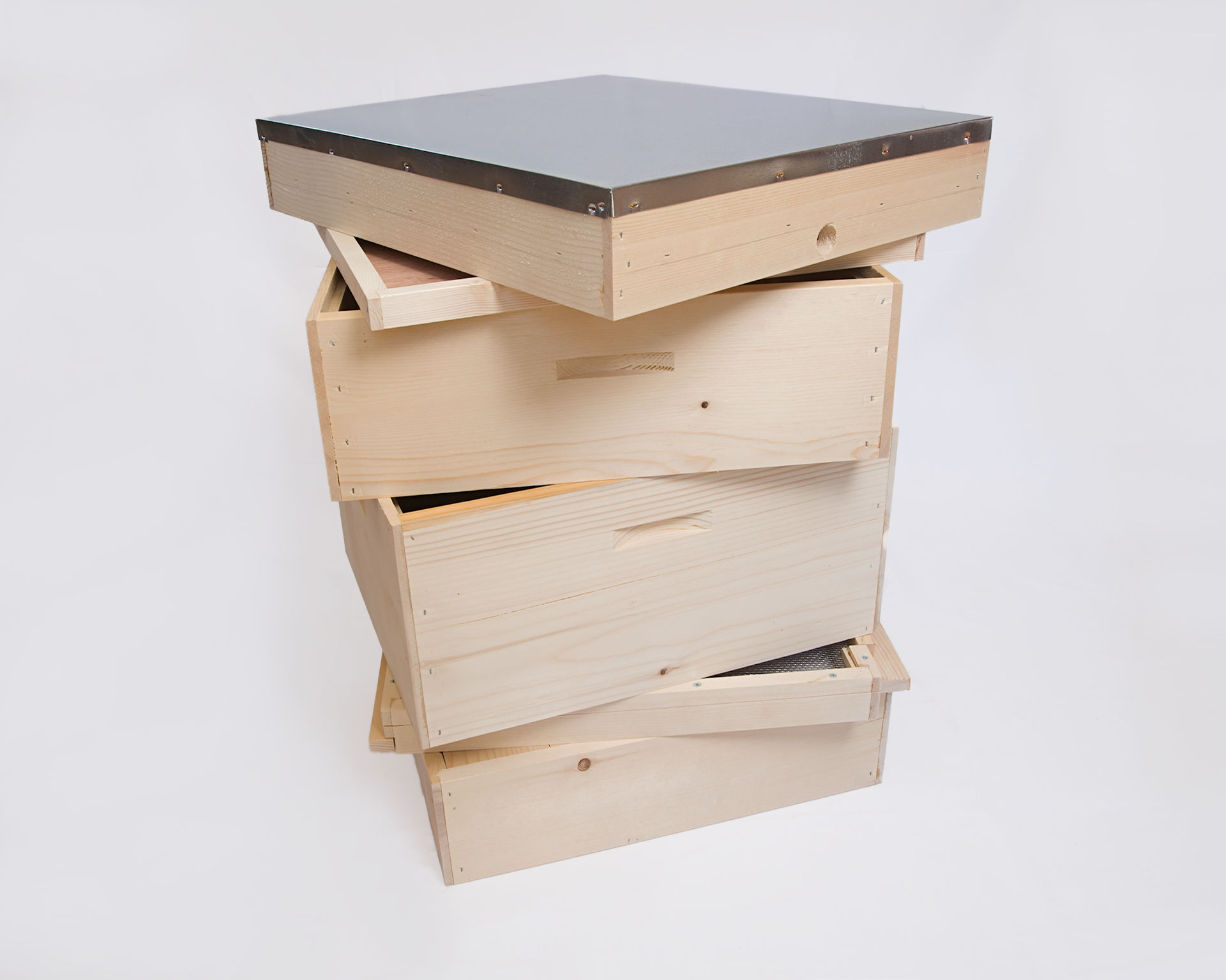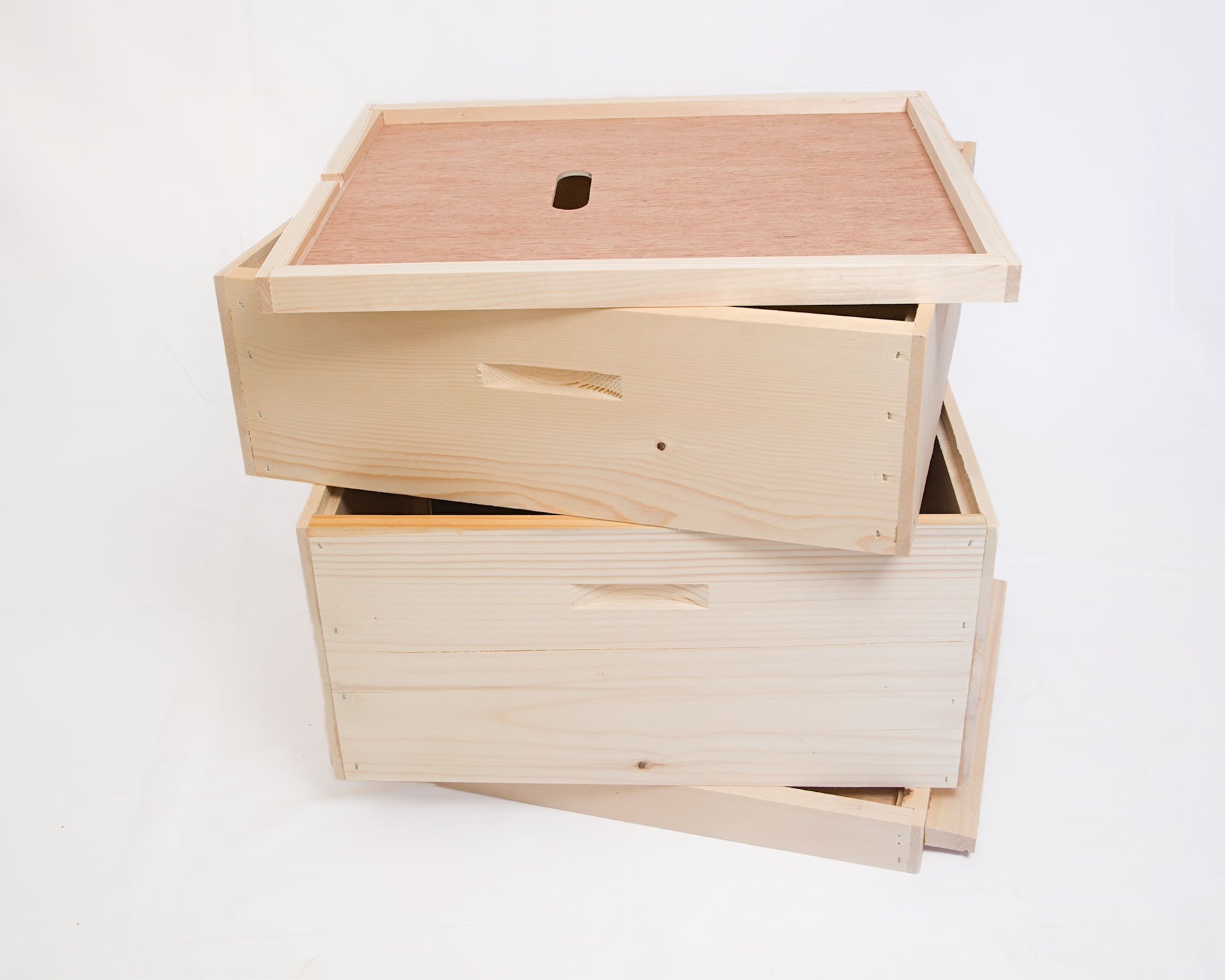 Brood boxes, supers, screened bottom entry boards with mite counting board & galvanised mesh, inside covers, insulated telescopic covers, migratory covers with rim.