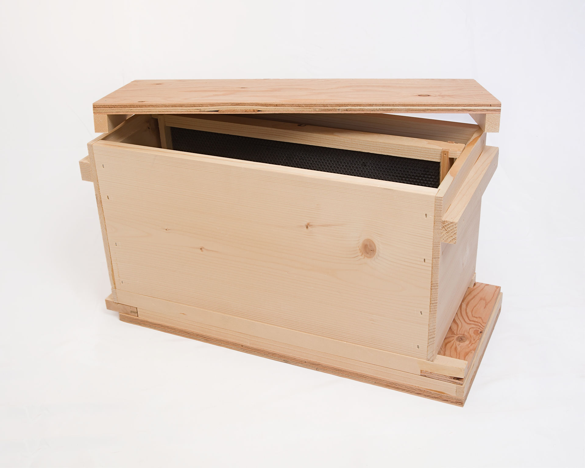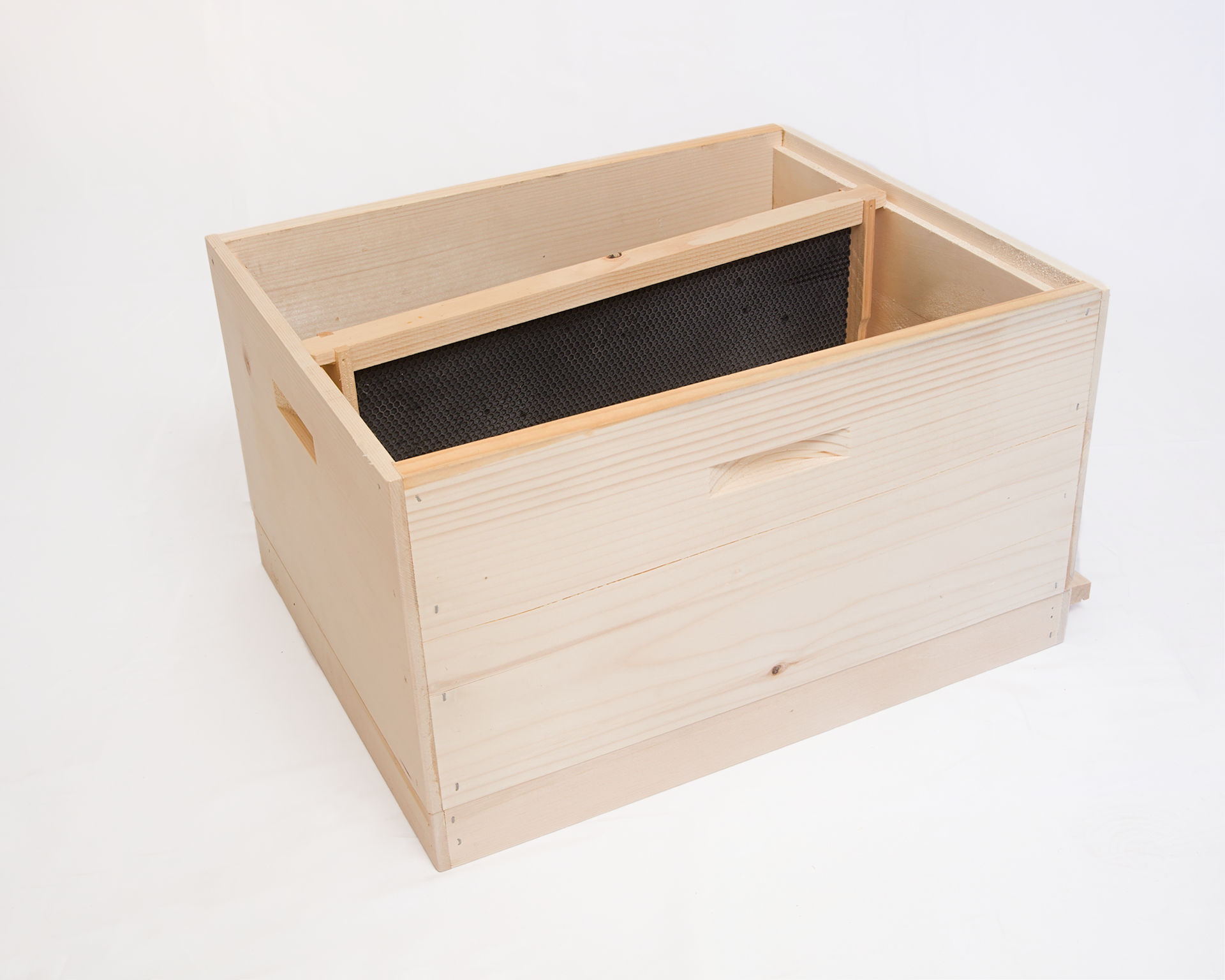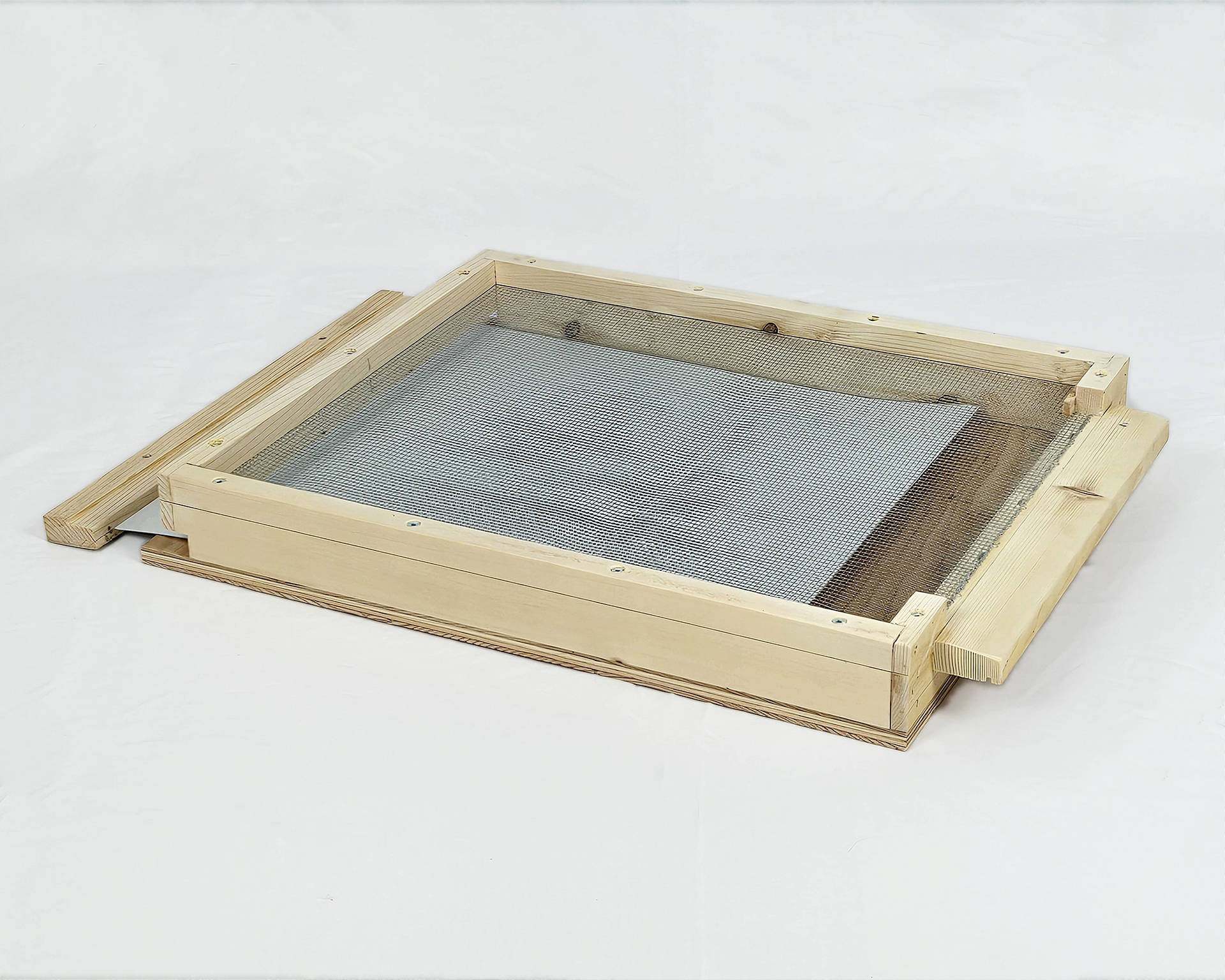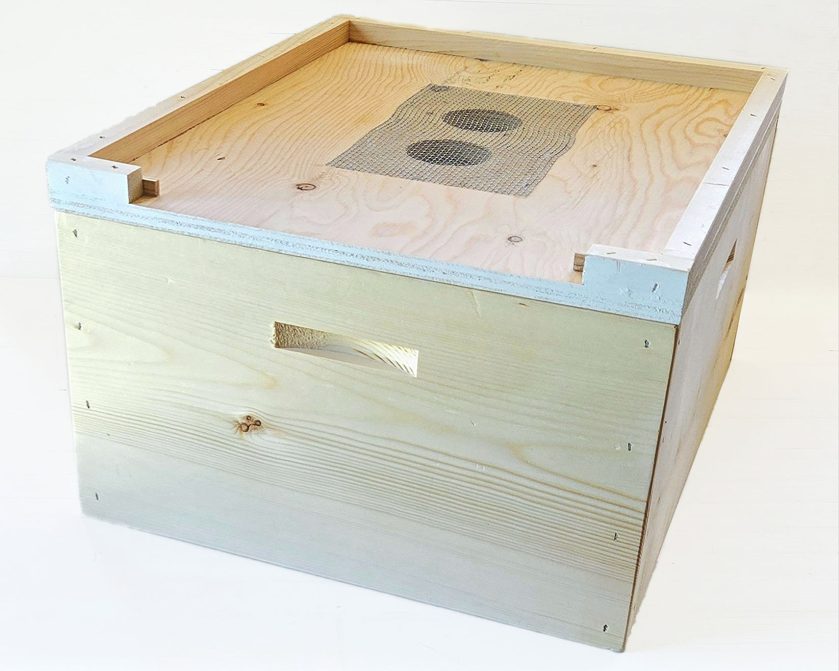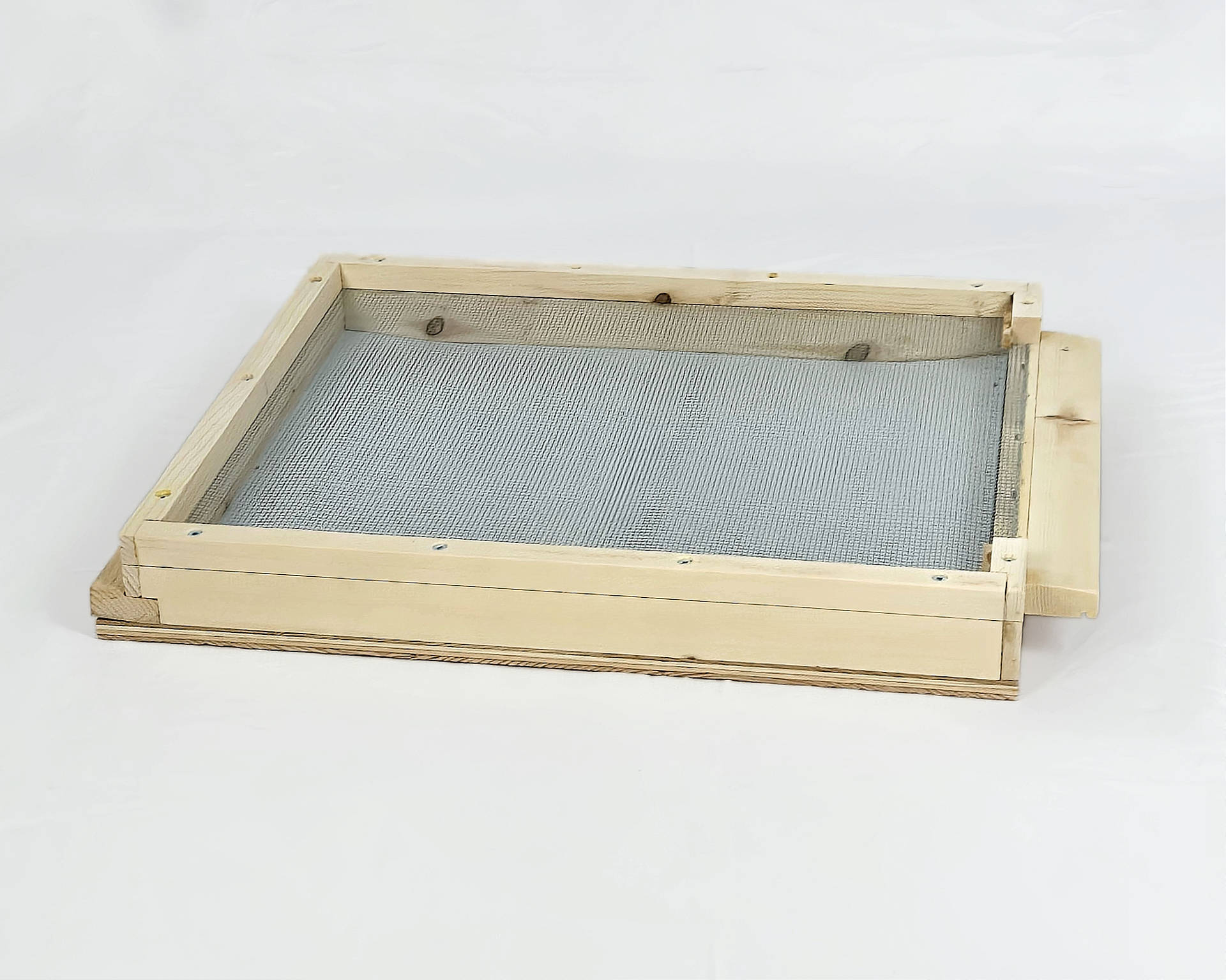 Brood boxes, supers, screened bottom entry boards with mite counting board & galvanised mesh, inside covers, insulated telescopic covers, migratory covers with rim.