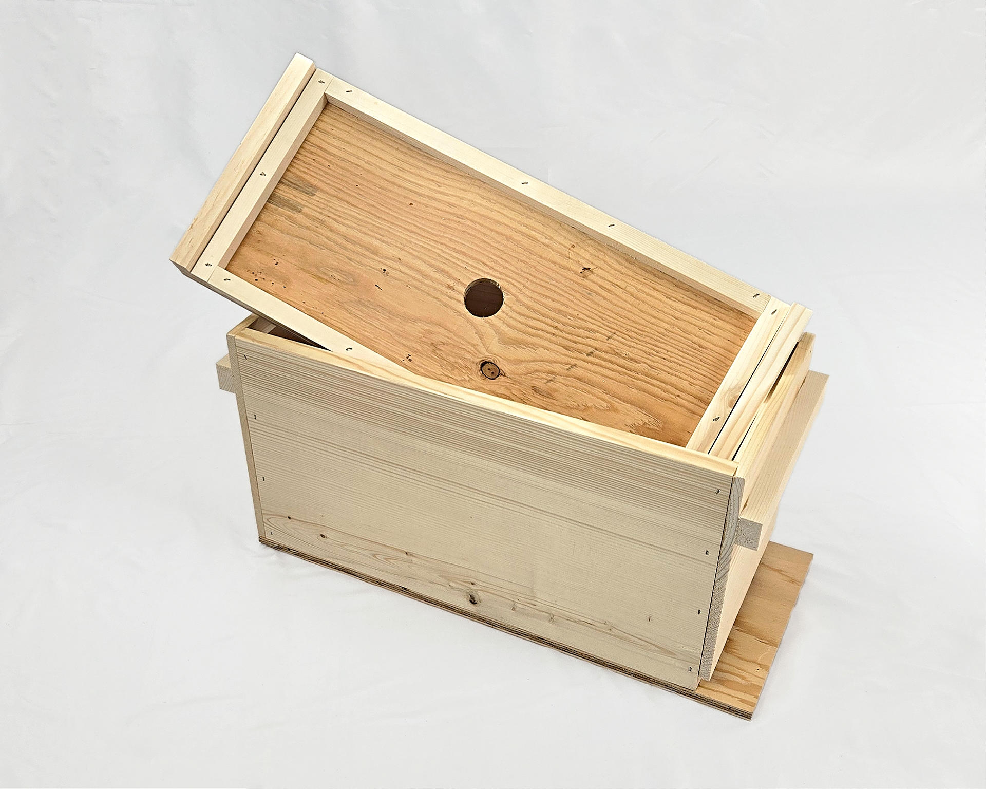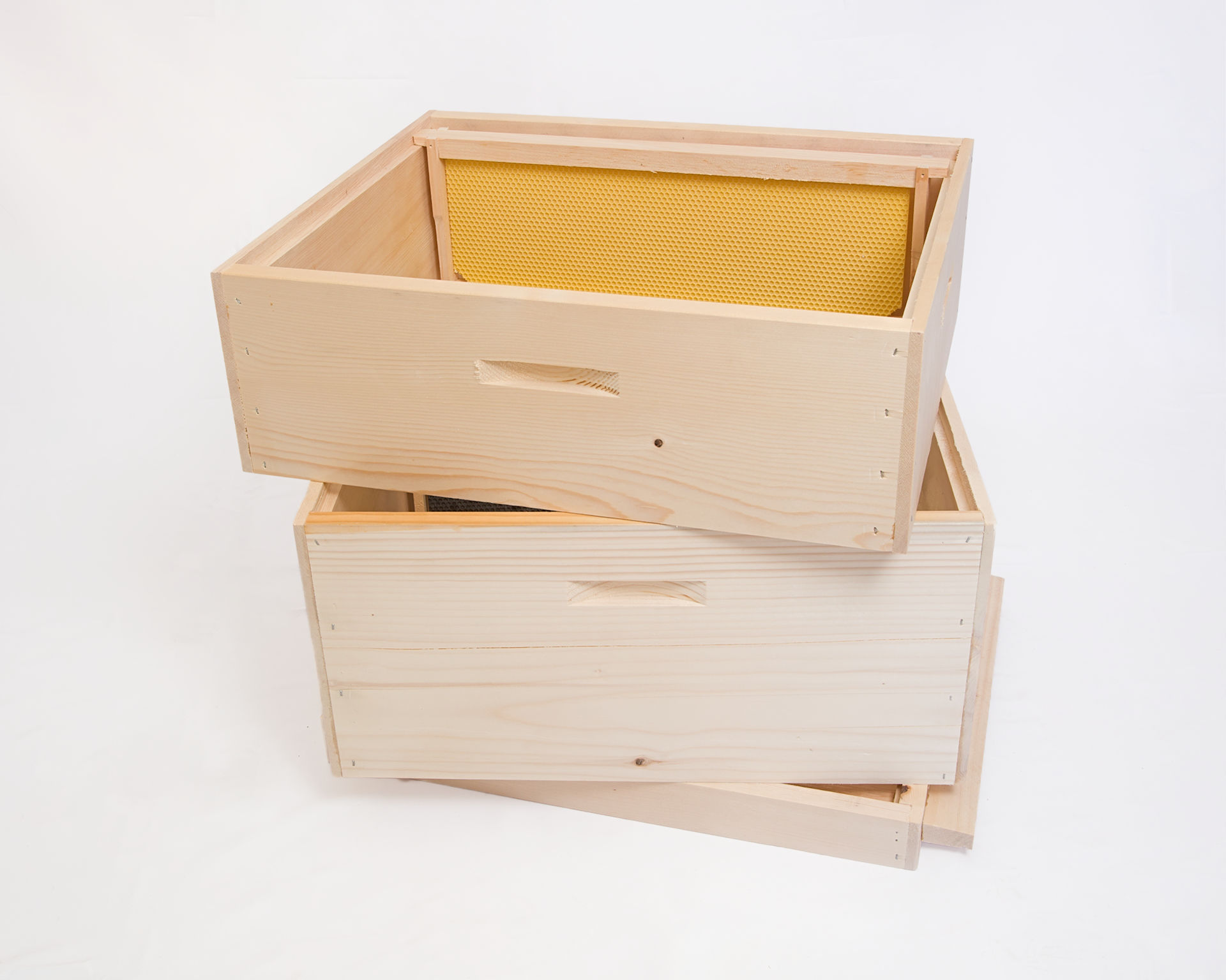 Nuc boxes 5-frames or sized to suit, supers, solid-bottom entry boards, screened bottom entry boards with mite counting board, migratory covers with rim.